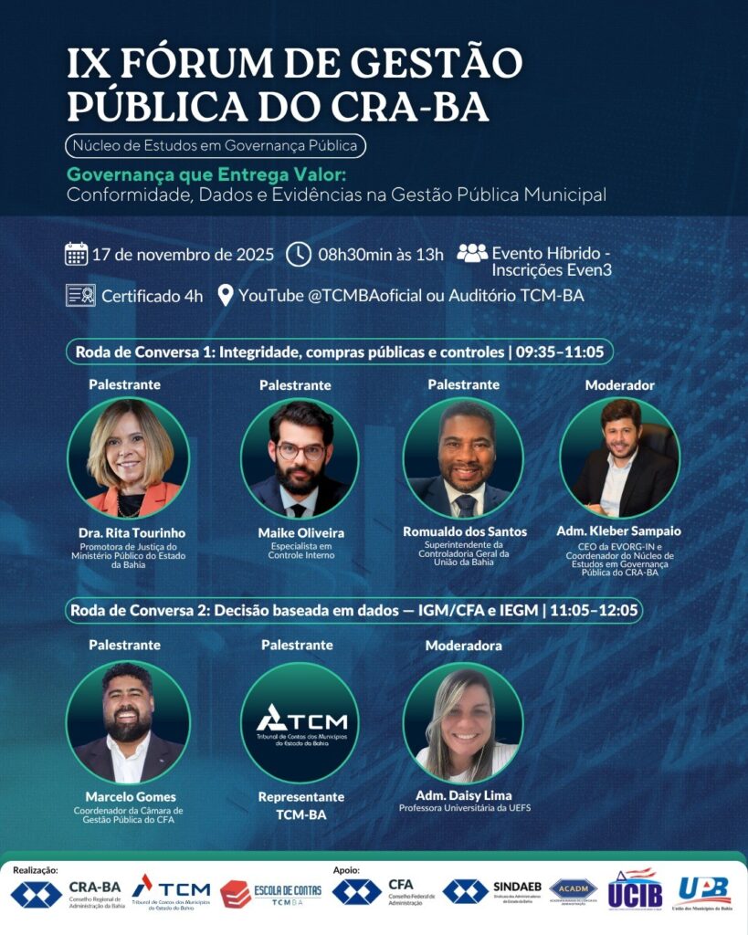 A busca por eficiência, transparência e decisões baseadas em evidências será o foco do IX Fórum de Gestão Pública do Conselho Regional de Administração da Bahia (CRA-BA), que acontece no dia 17 de novembro, das 8h30 às 13h, no auditório do Tribunal de Contas dos Municípios da Bahia (TCM-BA), com transmissão simultânea pelo canal oficial do órgão no YouTube. O evento é gratuito, oferece certificação de quatro horas e está com inscrições abertas para profissionais e estudantes, incluindo bacharéis, tecnólogos e alunos em formação nas áreas da Administração e Tecnologias em Gestão.