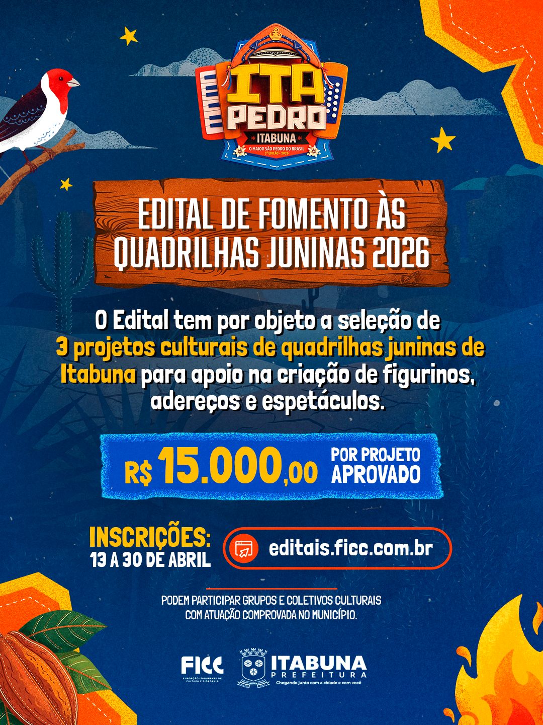 A valorização da cultura nordestina ganha mais um importante incentivo em Itabuna. Foi lançado o Edital de Chamamento Público nº 002/2026 da Fundação Itabunense de Cultura e Cidadania (FICC), voltado ao fomento das tradicionais quadrilhas juninas, uma das expressões mais marcantes da cultura popular brasileira.