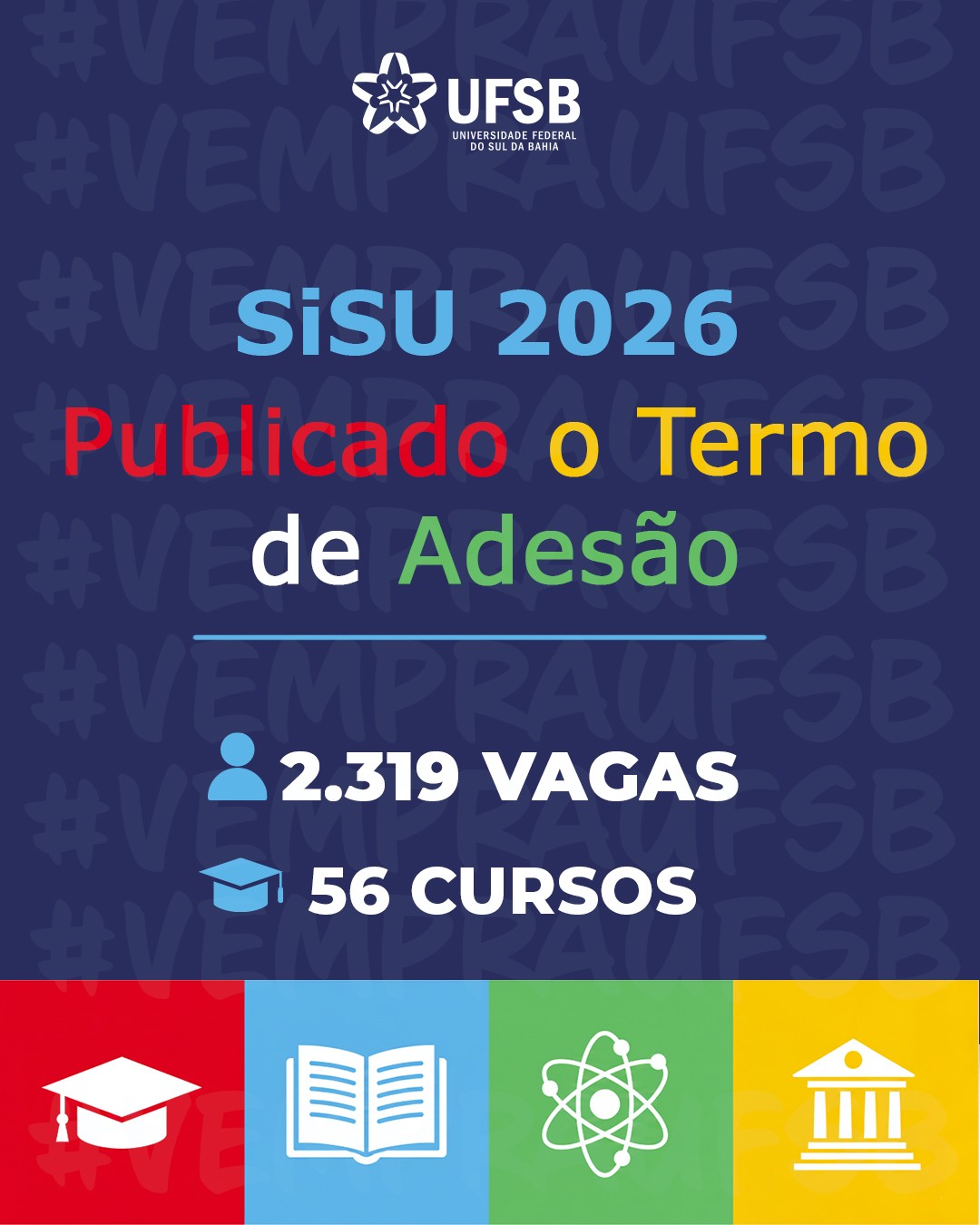 A Universidade Federal do Sul da Bahia (UFSB) vai oferecer 2.319 vagas em 56 cursos de graduação no Sisu 2026. Os detalhes constam do termo de adesão ao Sisu 2026, assinado e enviado à Secretaria de Educação Superior do Ministério da Educação.