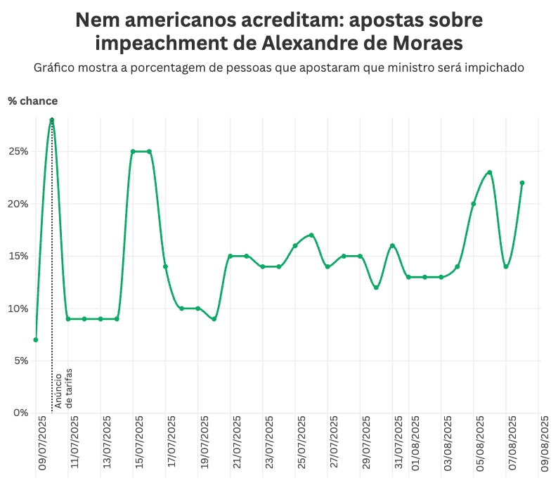 O pico de apostas favoráveis ao impeachment de Alexandre de Moraes aconteceu em 10 de julho de 2025, quando a tensão entre Brasil e Estados Unidos atingiu um novo patamar. Na data, o presidente americano Donald Trump anunciou uma tarifa de 50% sobre produtos brasileiros, justificando a medida como resposta direta às decisões do Supremo Tribunal Federal contra o ex-presidente Jair Bolsonaro, muitas delas assinadas por Moraes.
