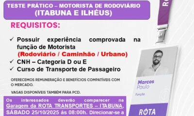 A Rota Transportes abriu mais 40 vagas para contratação de motoristas em Itabuna, Ilhéus e Vitória da Conquista. São 20 vagas para motoristas rodoviários na...
