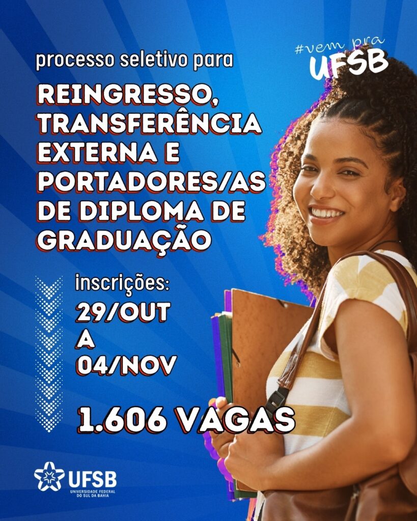 Universidade Federal do Sul da Bahia (UFSB) abriu inscrições para o Processo Seletivo para Reingresso, Transferência Externa e Portadores/as de Diploma de Graduação. Ao todo serão ofertadas 1606 vagas em diversos cursos dos três campi localizados em Ilhéus, Porto Seguro e Teixeira de Freitas.