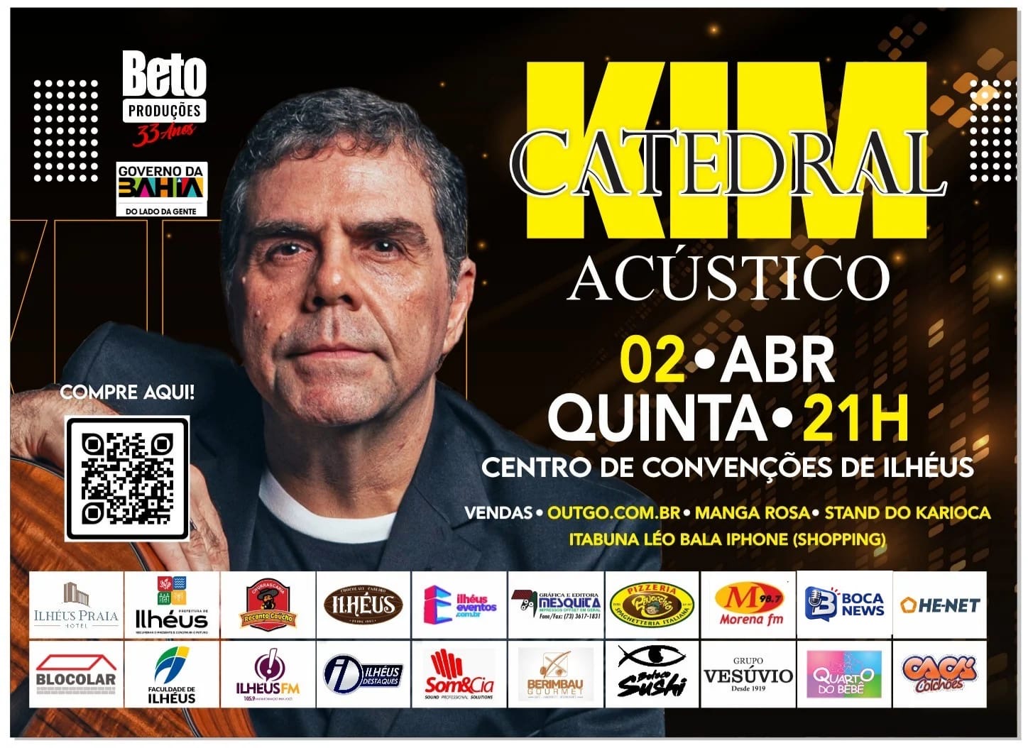Os fãs da Banda Catedral já podem se preparar para uma noite de muita emoção e nostalgia. Kim, vocalista do grupo, se apresenta em Ilhéus no dia 02 de abril (quinta-feira), às 21h, no Centro de Convenções, trazendo um espetáculo acústico repleto de grandes sucessos que marcaram a trajetória da banda.