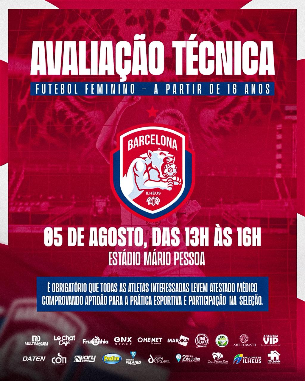 O Barcelona de Ilhéus promove, na próxima terça-feira, 5 de agosto, a avaliação para compor o elenco do time feminino profissional do clube. A seletiva acontece no Estádio Mário Pessoa, das 13h às 16h, e é voltada para atletas a partir de 16 anos.
