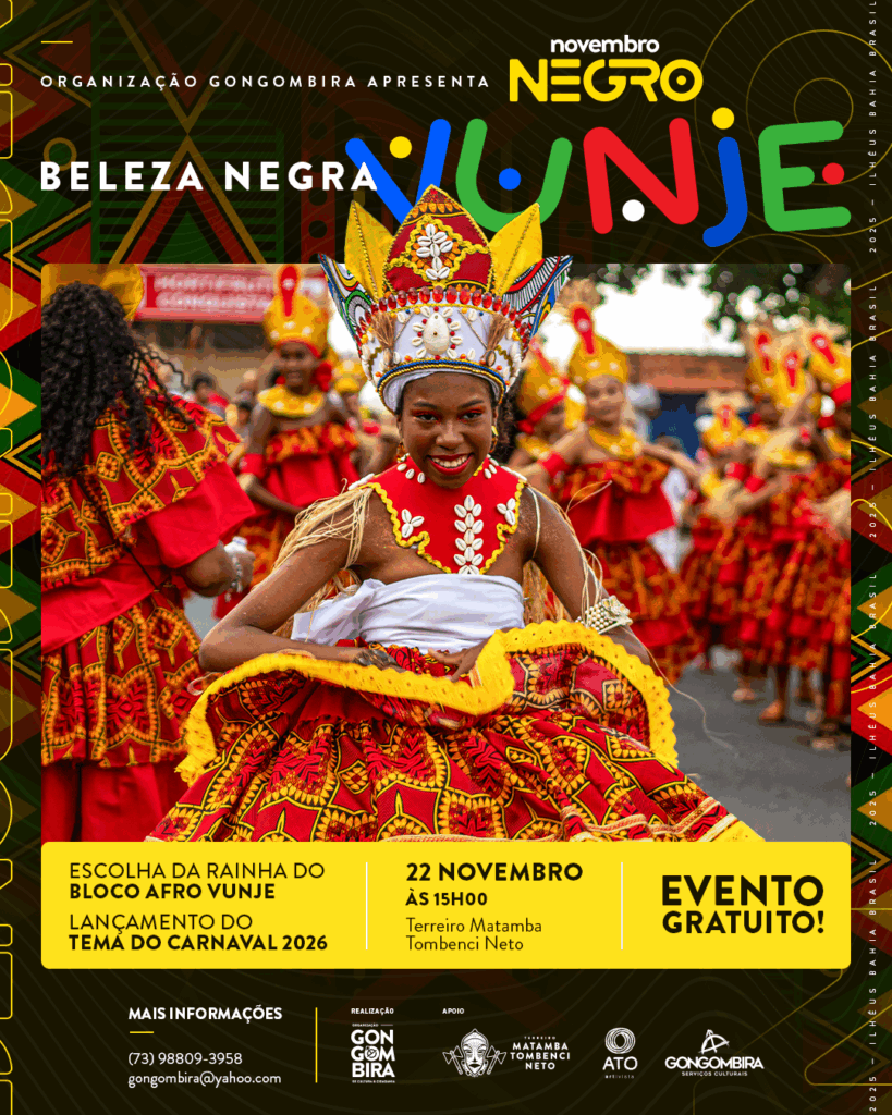 A ONG Gongombira realiza neste sábado, dia 22, a eleição da nova Rainha do Bloco Afro Mirim Vunje, em mais uma edição do tradicional Evento da Beleza Negra, que integra a programação do Novembro Negro da instituição. A celebração acontece a partir das 15h, na sede da ONG, localizada no Terreiro Matamba Tombenci Neto, no Alto da Conquista, com entrada gratuita.
