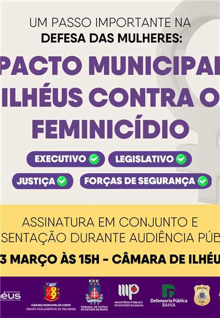 A Prefeitura de Ilhéus participa, nesta segunda-feira (23), da cerimônia de lançamento do Pacto Municipal Contra o Feminicídio. O evento ocorre no Plenário da Câmara de Vereadores, localizado na Rua Araújo Pinho, nº 19, no Centro. A assinatura do documento será realizada durante uma audiência pública em comemoração ao Dia Internacional da Mulher. Quem não puder comparecer presencialmente poderá acompanhar a transmissão ao vivo pelo canal oficial da TV Câmara de Ilhéus no YouTube.