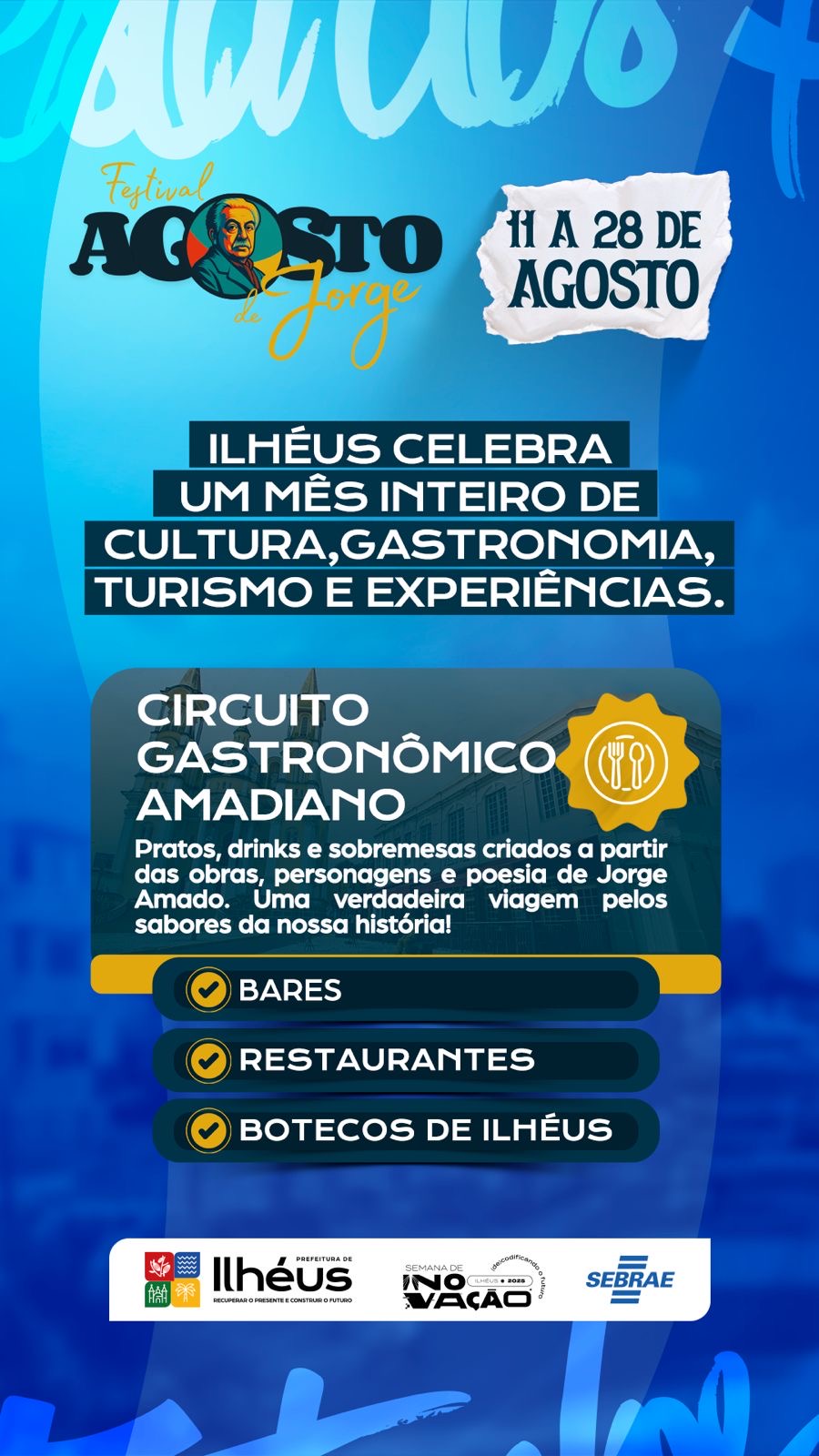 A Prefeitura de Ilhéus realiza o Festival Agosto de Jorge, em uma iniciativa conjunta entre as secretarias municipais de Turismo, Educação, Cultura, Juventude, Esporte e Lazer, e Desenvolvimento Econômico e Inovação, com apoio do Sebrae e da TV Santa Cruz. A programação acontece durante todo o mês de agosto e é dedicada à obra e ao legado do escritor Jorge Amado. A iniciativa conta com a participação de diversas instituições e representantes do trade turístico local.