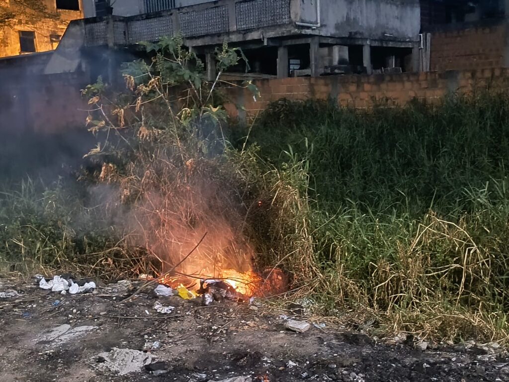 Moradores queimam galhos para afastar muriçoca enquanto aguardam limpeza do canal e aplicação de fumacê pela prefeitura.