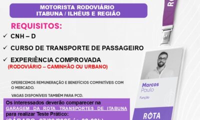A Rota Transportes está realizando seleção para contratação de motoristas rodoviários das cidades de Itabuna, Ilhéus e região. Os interessados devem comparecer à sede da...