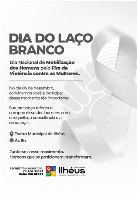 A Prefeitura de Ilhéus, por meio da Secretaria Municipal de Políticas para Mulheres, realiza, nesta sexta-feira (05), uma ação referente ao Dia do Laço Branco — Dia Nacional de Mobilização dos Homens pelo Fim da Violência contras as Mulheres. A data busca chamar a atenção para a responsabilidade masculina na construção de relações mais justas e seguras, incentivando atitudes que promovam respeito e prevenção.