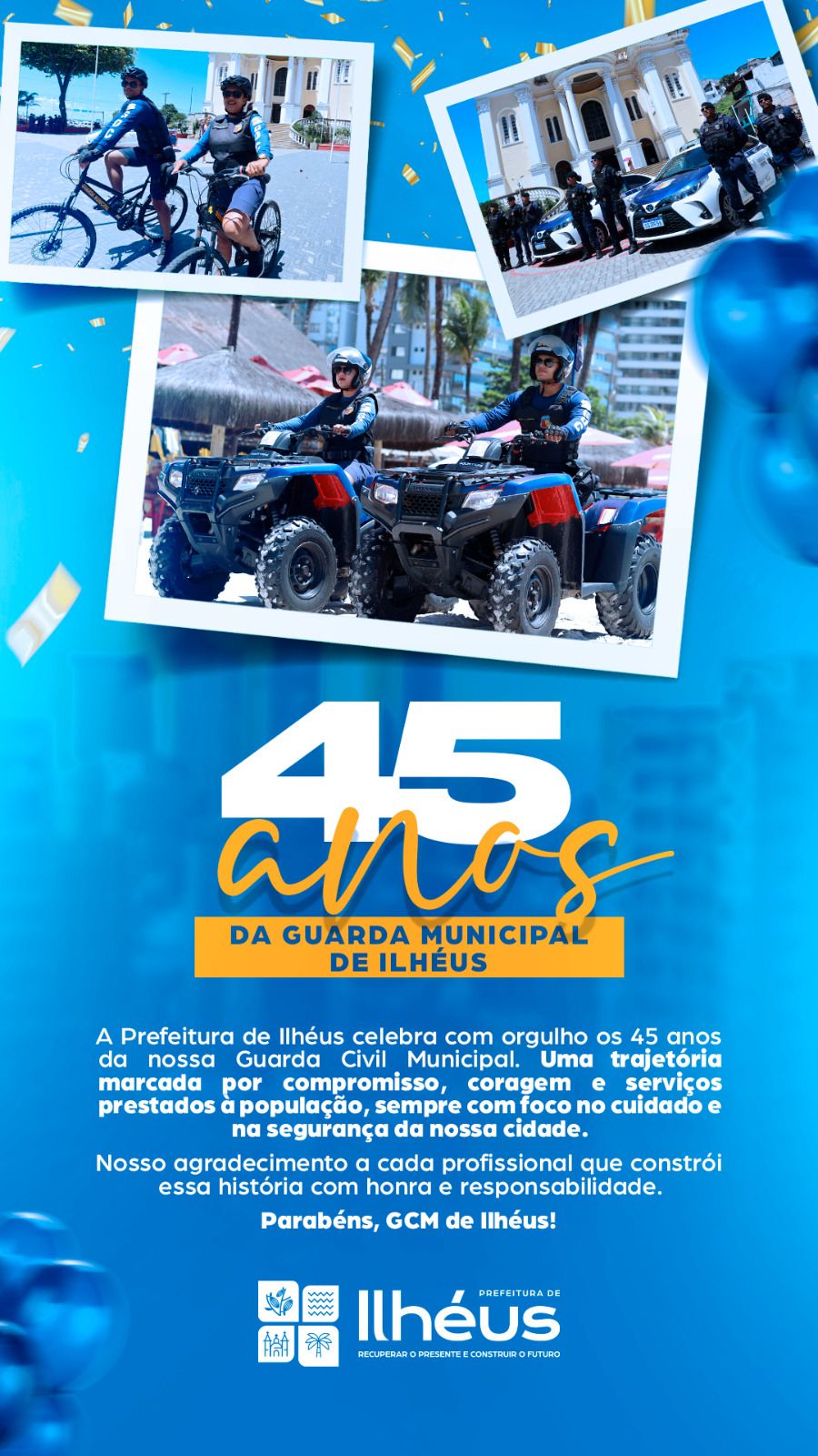“Somos gratos a cada homem e mulher da Guarda Municipal. São 45 anos de muita honra, responsabilidade e dedicação ao povo de Ilhéus”, disse o prefeito Valderico Junior.