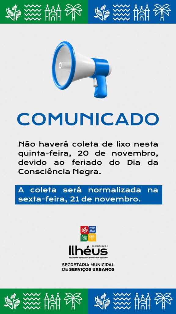 A Prefeitura de Ilhéus, por meio da Secretaria de Serviços Urbanos (SECSURB), informa que não haverá coleta de lixo nesta quinta-feira (20), devido ao feriado do Dia da Consciência Negra.