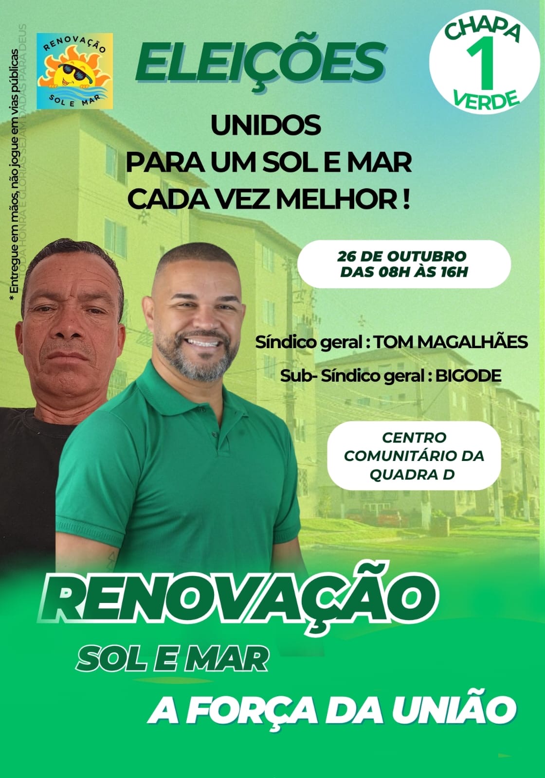Segundo Tom Magalhães, o objetivo é “fazer do Sol e Mar um lugar mais integrado, sustentável e acolhedor para todos”. Ele destaca que a proposta de unificação das gestões visa otimizar recursos e ampliar os resultados. “Com uma administração única, podemos ter mais eficiência e agilidade nas decisões, beneficiando os moradores dos dois conjuntos”, explica o candidato.