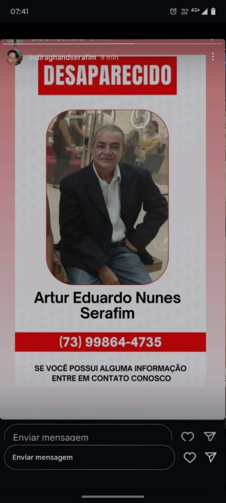 Quem tiver qualquer informação sobre seu paradeiro, por favor, entre em contato pelo telefone (73) 9 9864-4