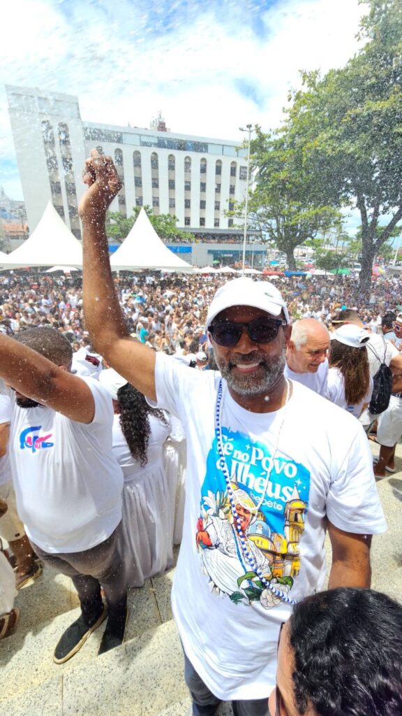 Com uma camiseta estampada “Fé no Povo de Ilhéus, Bebeto sinaliza a sua prioridade política na relação com a sociedade da Terra da Gabriela.