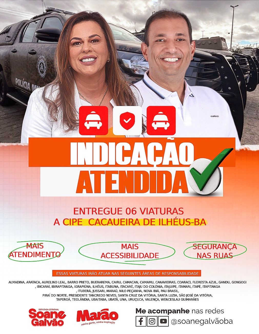 Ilhéus acaba de ser contemplada com 06 viaturas modelo picape, equipadas com cela e padronizadas pela SSP/PMBA, destinadas às Companhias Independentes de Policiamento Especializado (CIPEs). A ação é fruto de indicação do mandato da deputada estadual Soane Galvão (PSB) e representa um avanço concreto no reforço da segurança pública na região sul da Bahia.