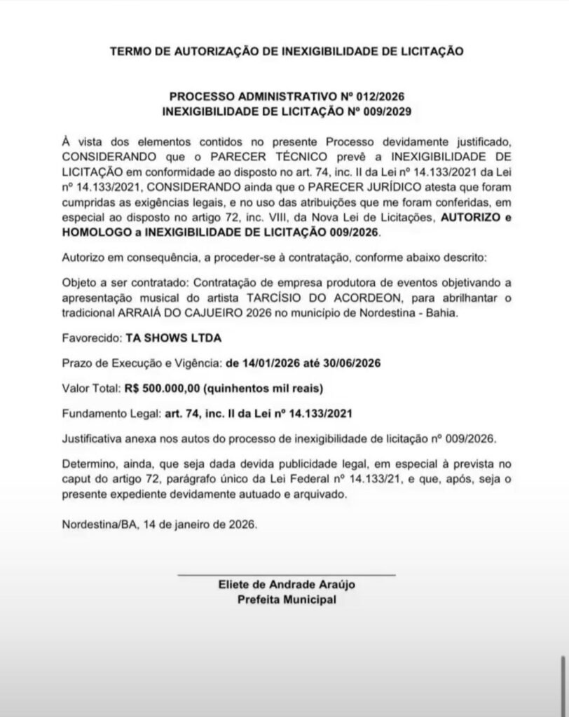 Apesar do alerta feito pela própria Prefeitura, atos administrativos publicados oficialmente chamaram atenção da população. No dia 14 de janeiro de 2026, a gestão municipal autorizou a contratação, por inexigibilidade de licitação, de um show artístico no valor de R$ 500 mil, meio milhão de reais, para apresentação do cantor Tarcísio do Acordeon no Arraiá do Cajueiro 2026.