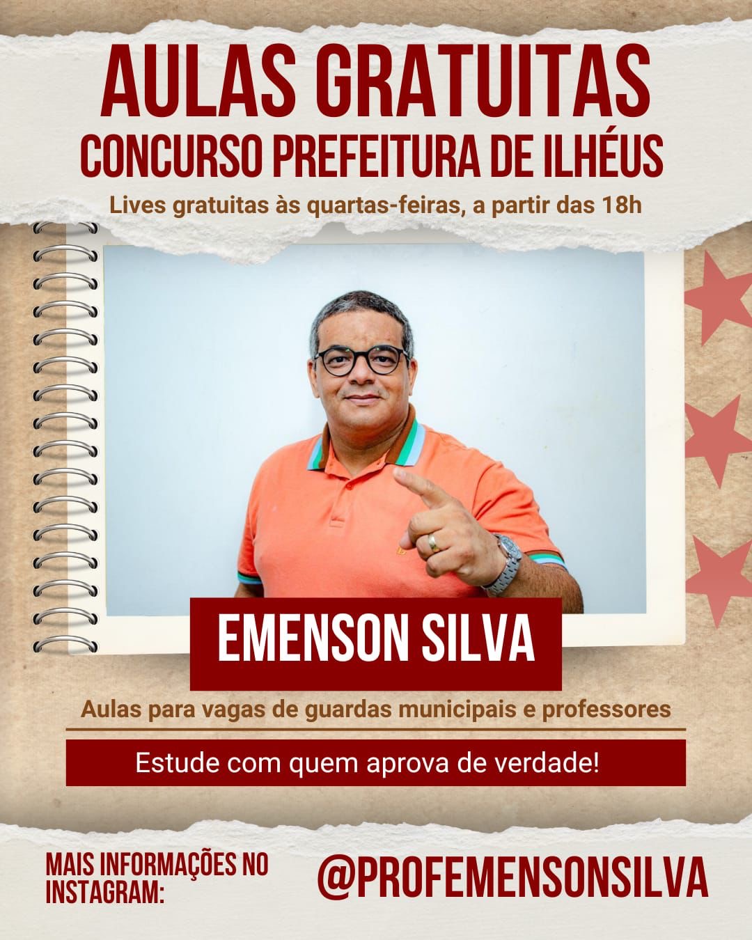 Pensando nisso, o **professor Emenson Silva**, referência em aprovações em concursos em Ilhéus e em toda a região, vai **ministrar aulas gratuitas pelo Instagram, todas as quartas-feiras**.