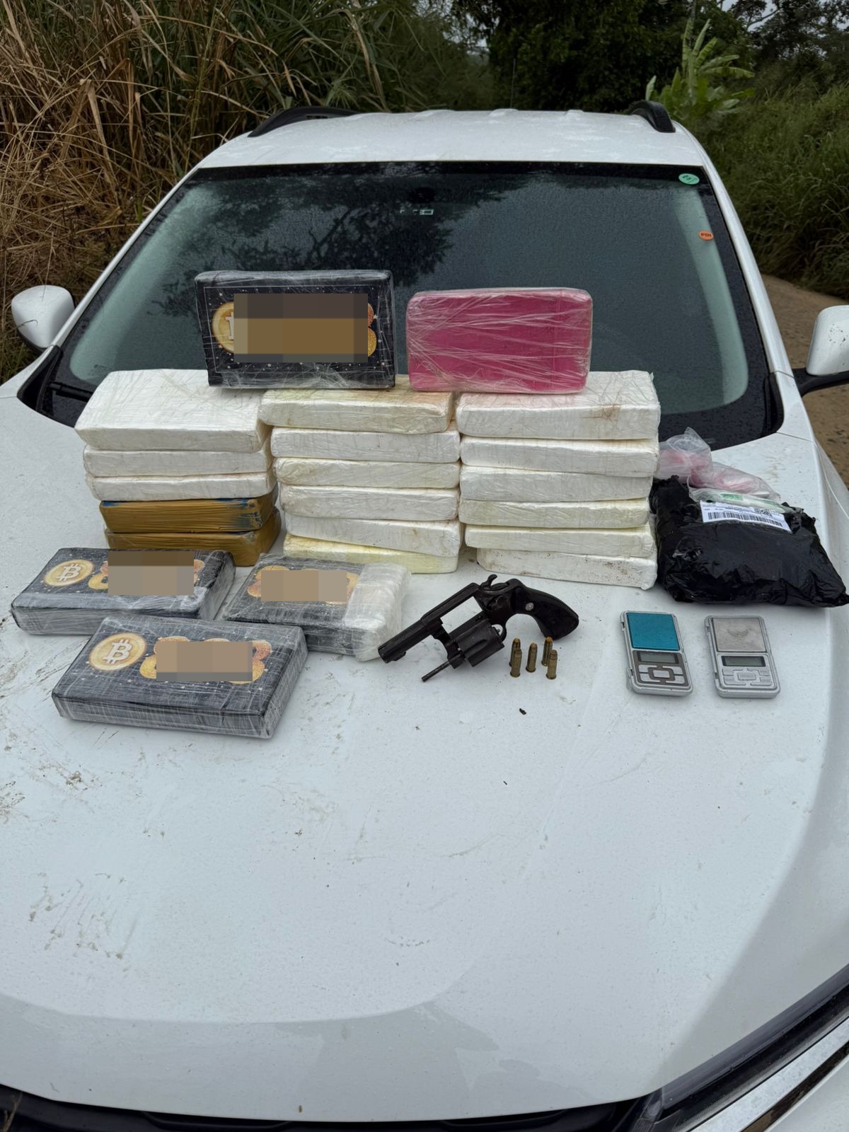 Durante a verificação no veículo, foram encontrados 19 kg de cocaína, 3 kg de crack, um revólver calibre .38 municiado, duas balanças de precisão e diversos materiais utilizados para o acondicionamento de entorpecentes. O carro, que possuía restrição de roubo, foi recuperado.