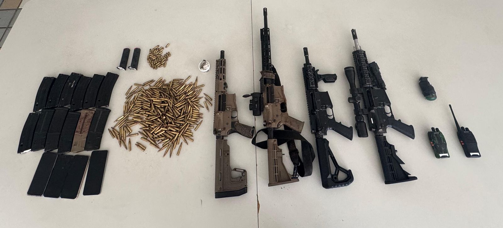 Na ação, foram apreendidos quatro fuzis calibre 556, 12 carregadores para fuzis e dois para pistolas, totalizando 14 carregadores, munições de calibres 5,56 e 380, uma granada, dois rádios comunicadores e porções de maconha e cocaína. Participaram da apreensão guarnições do Comando de Policiamento Regional do Extremo-Sul (CPR-ES), do 8º BPM, do BOPE e da CIPT/Rondesp Extremo-Sul, além de equipes da Polícia Civil (Core e DTE).